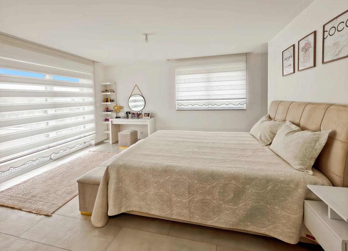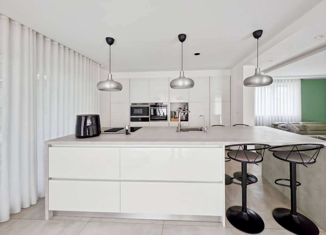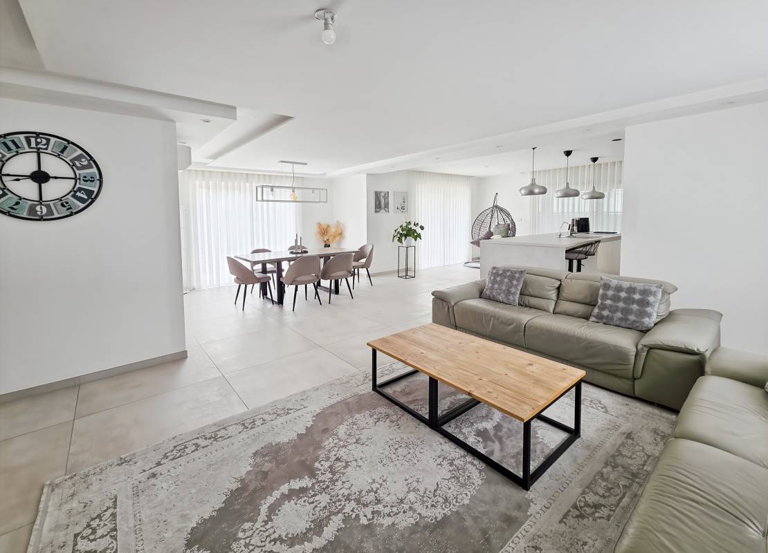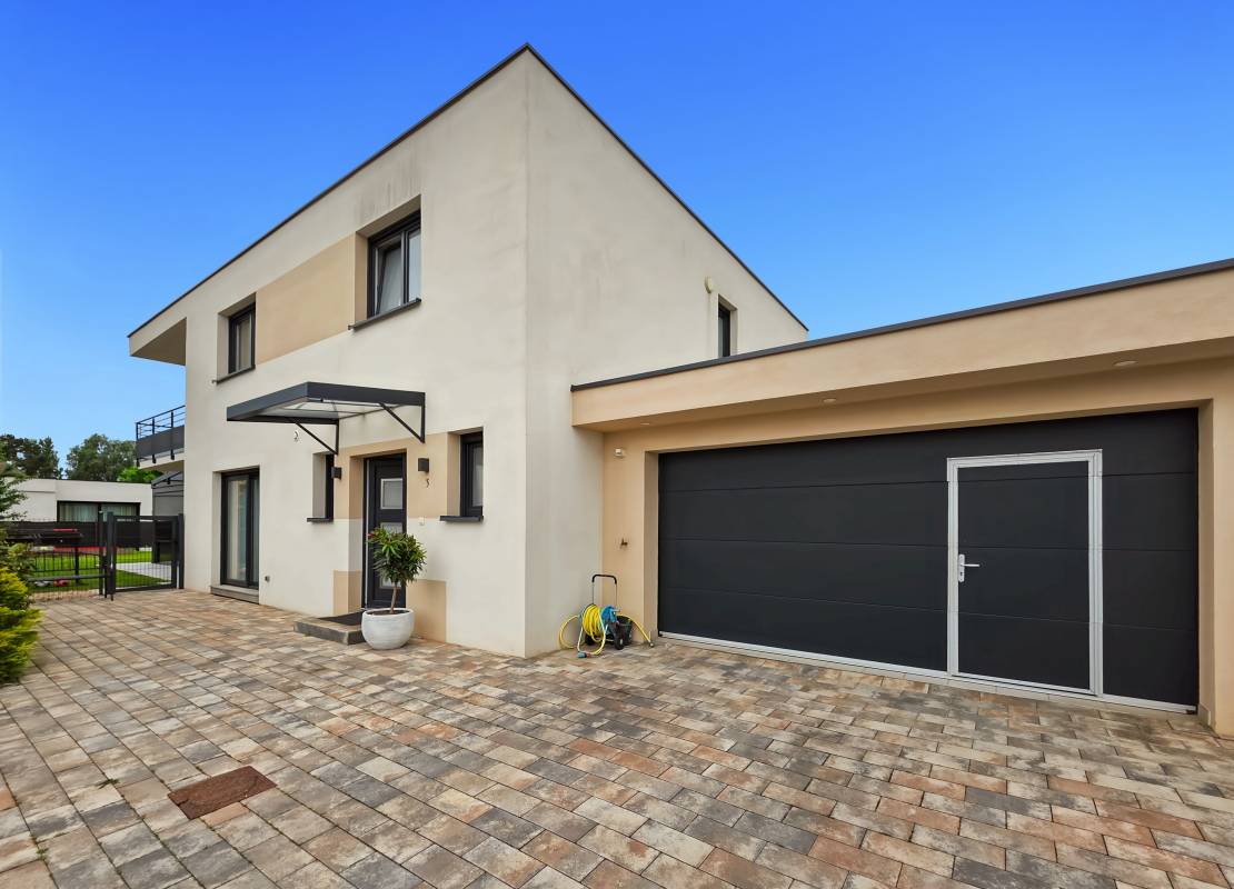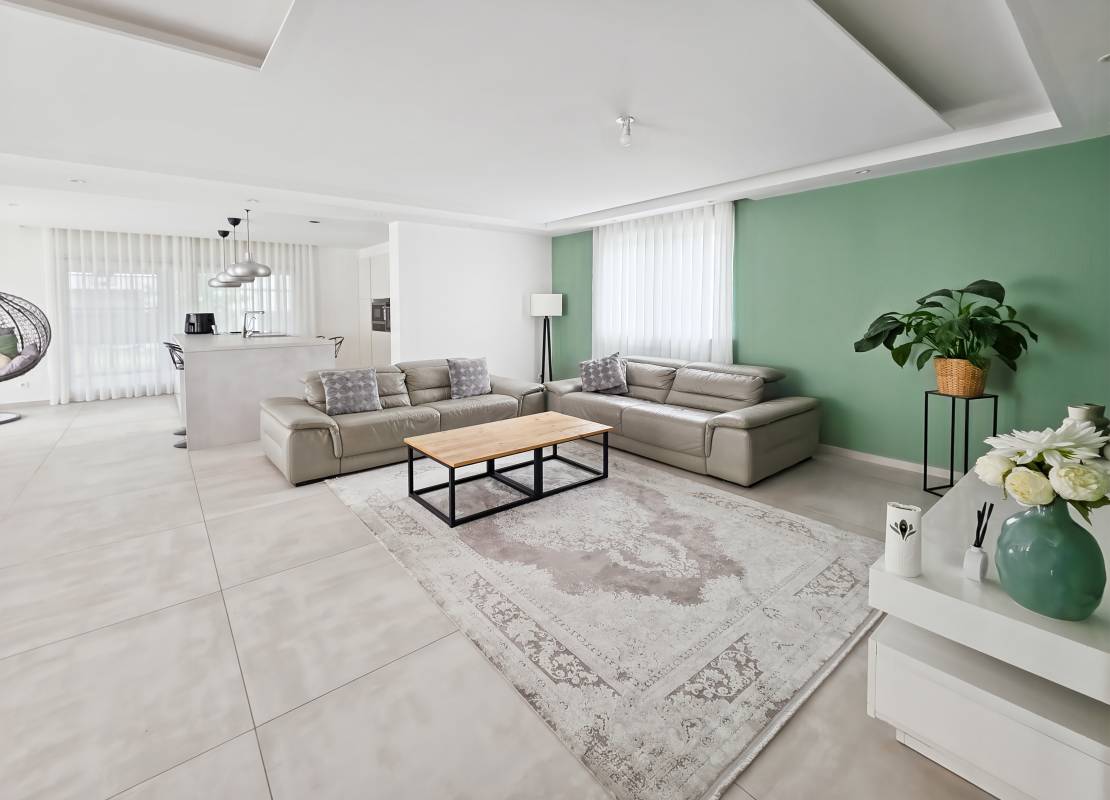 Vous serez accueilli par une entrée avec placards intégrés, une salle d’eau avec WC, une chambre (10 m²), ainsi qu’une cuisine équipée ouverte sur un vaste salon-séjour de 38 m² donnant accès à une terrasse orientée ouest avec pergola bioclimatique. Accès direct au garage double de 36 m².