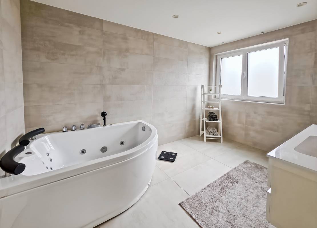 L’étage se compose de quatre chambres, dont une suite parentale de 22 m² avec dressing, salle d’eau privative et balcon. Vous y trouverez également une grande salle de bain avec douche, baignoire balnéo et WC.