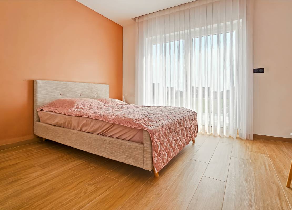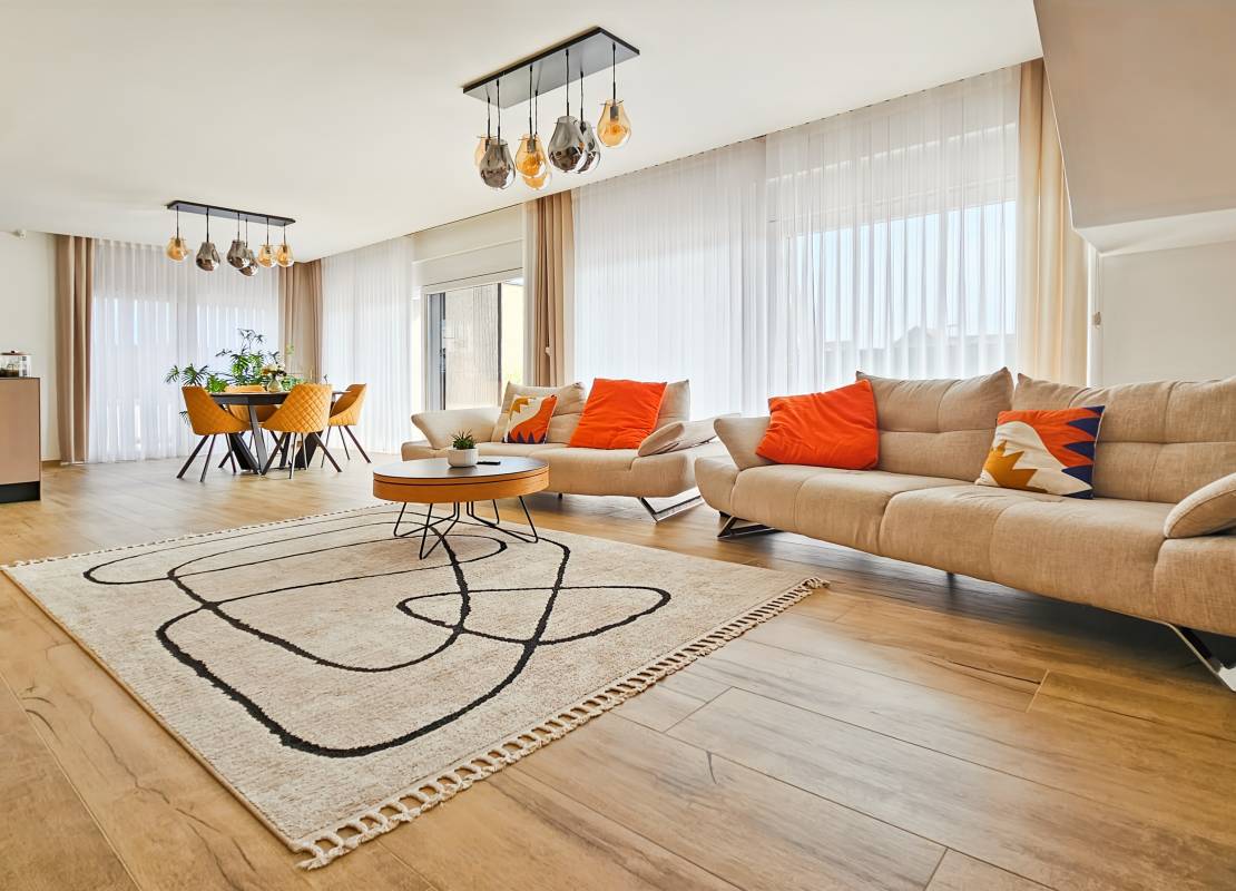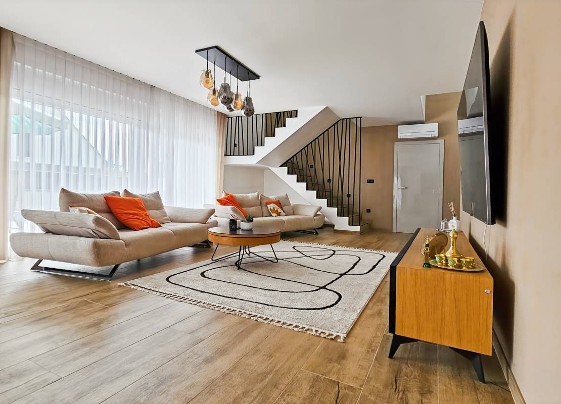 Dès l’entrée, un vaste espace de vie baigné de lumière vous accueille, composé d’un salon-séjour chaleureux, d’une cuisine équipée au design moderne avec cellier attenant, et d’un accès direct à une terrasse idéalement orientée, prolongée par une piscine chauffée de 3,5 x 7 m.