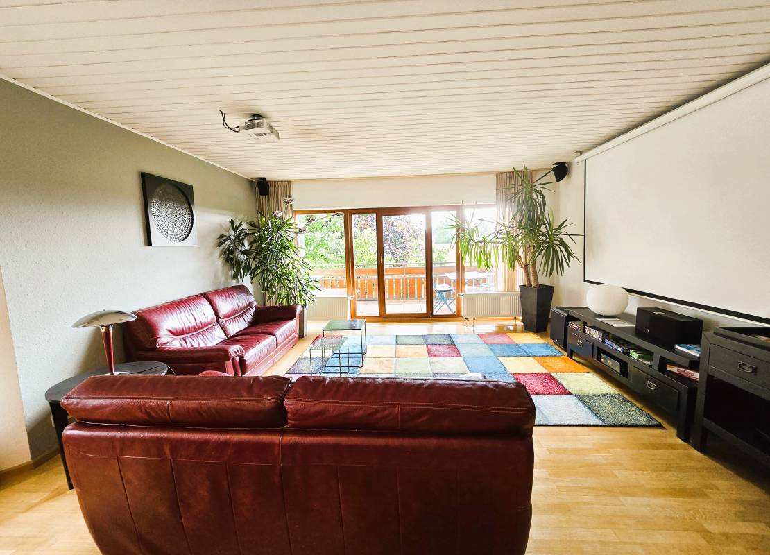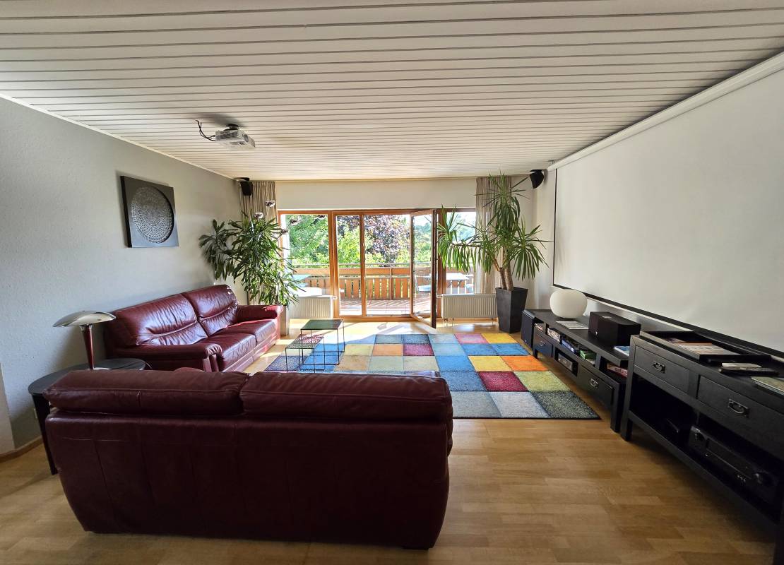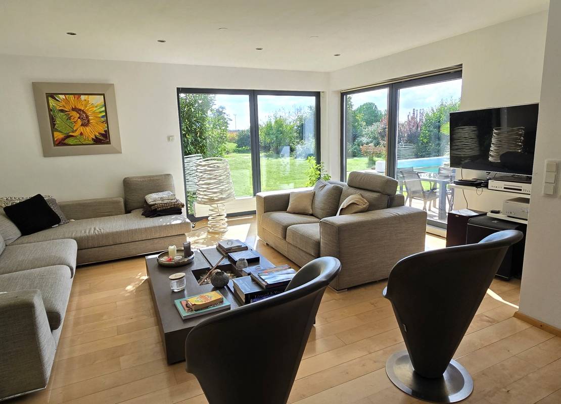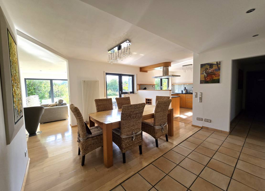 Une spacieuse pièce de vie ouverte sur le jardin, comprenant un double salon avec cheminée à insert, un espace salle à manger et une cuisine conviviale.