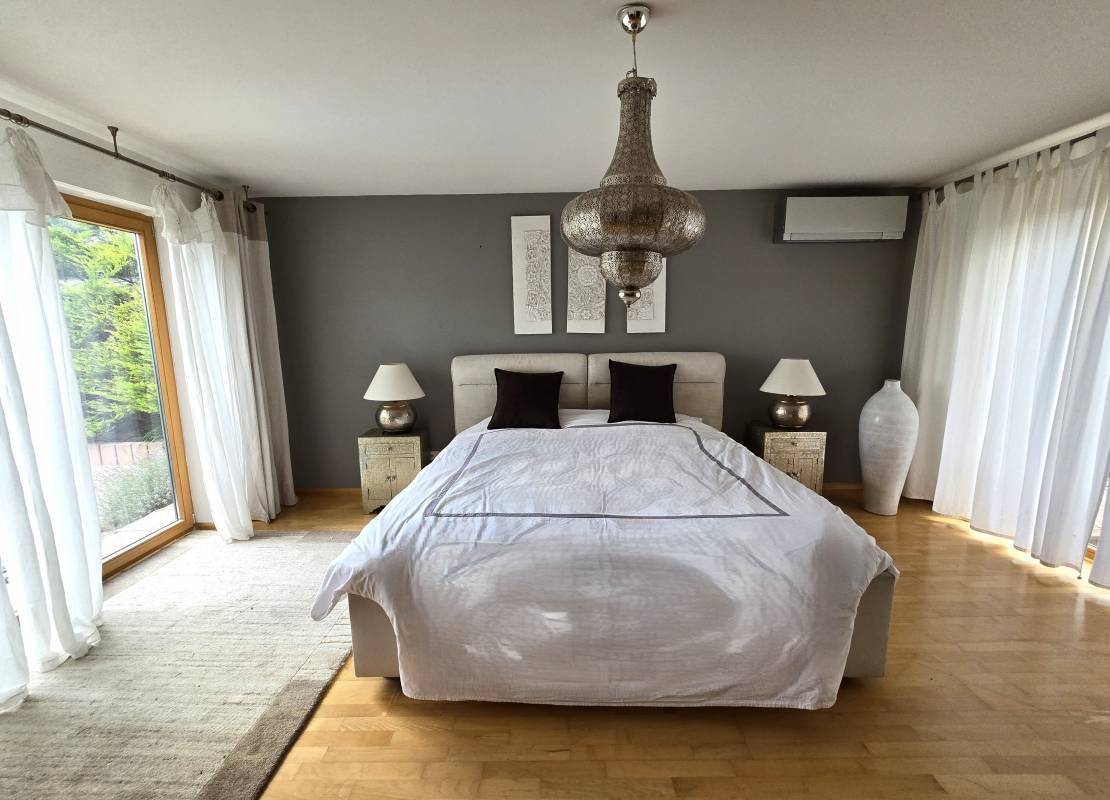 L’une des chambres bénéficie d’un accès direct à une terrasse menant au jardin.