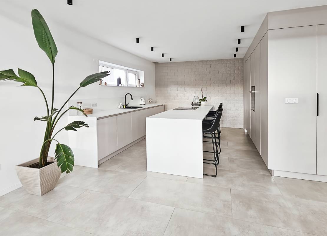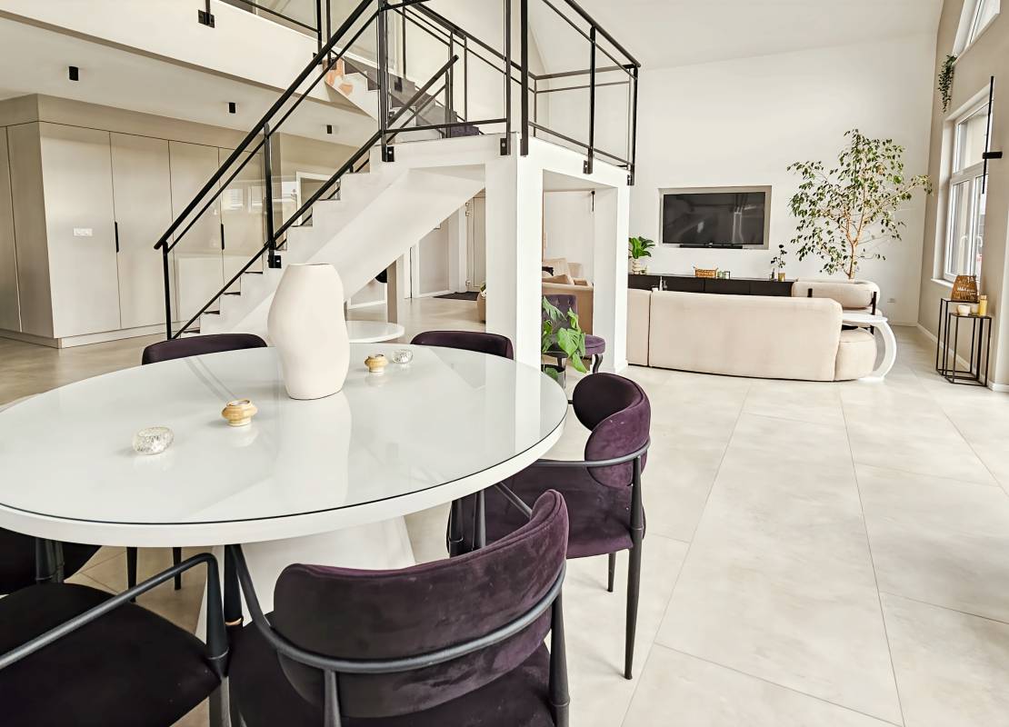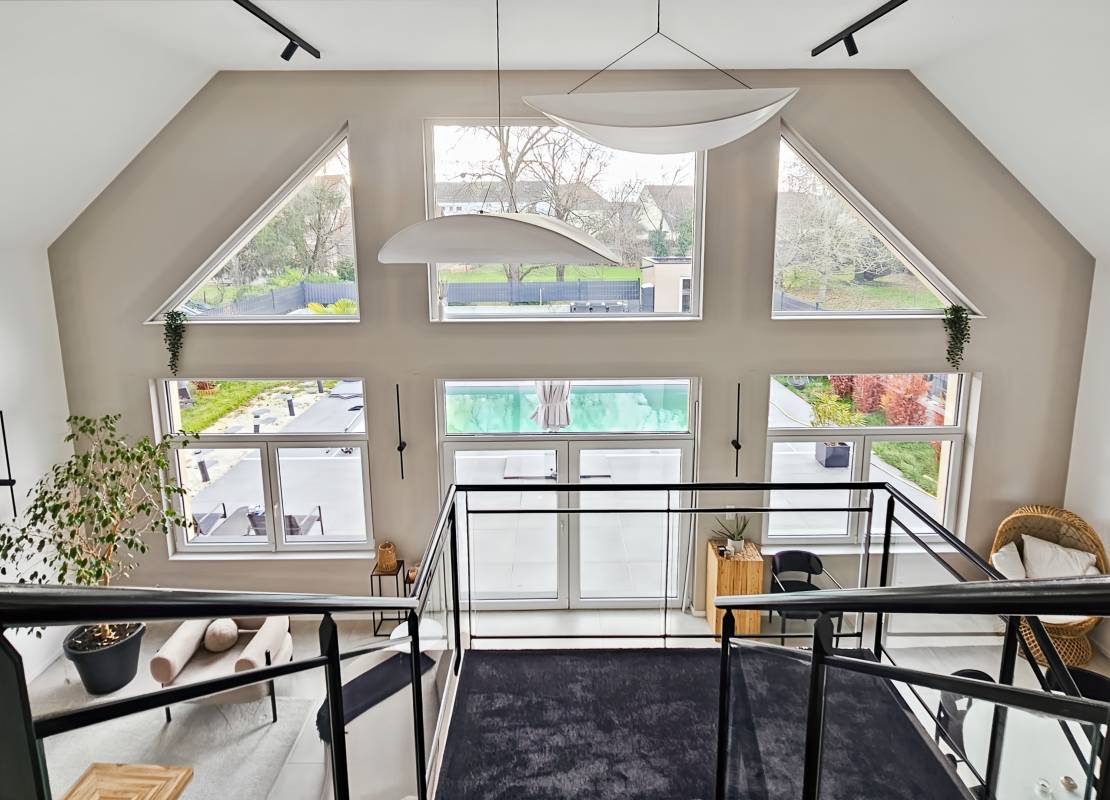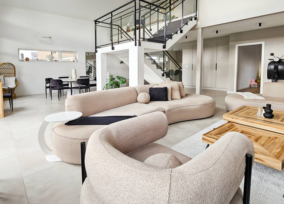 Le rez-de-chaussée accueille un vaste espace de vie de plus de 80 m² regroupant salon, salle à manger et cuisine ouverte entièrement aménagée et équipée. De grandes baies vitrées apportent une luminosité remarquable.