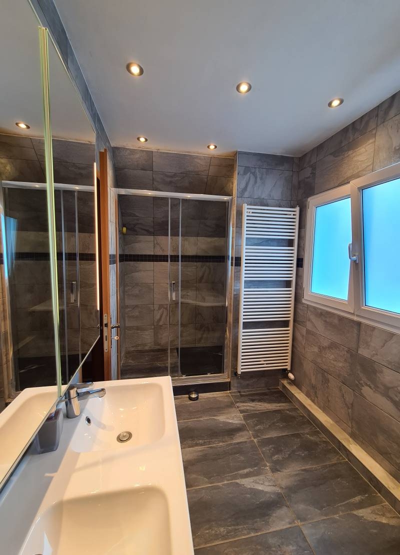 L’étage offre également une salle de bain avec baignoire, douche et meuble 2 vasques, avec radiateur sèche serviette.