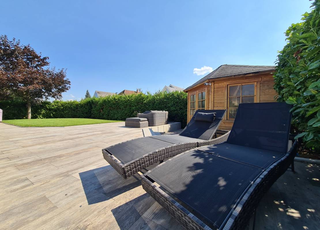 Les extérieurs : Magnifique terrasse. Piscine chauffée. Arrosage automatique. Cabanon extérieur permettant le stockage des accessoires piscine et jardin.